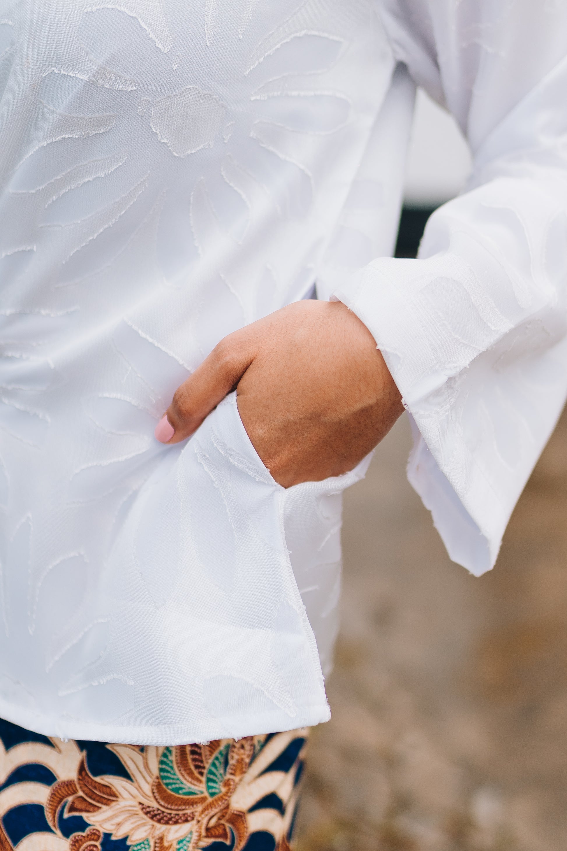 The white kurung is fully lined with soft luce material, paired with functional pearl collar buttons and two side pockets. Made from premium chiffon uragiri, the kurung top features a classic yet elevated look with the soft textured fabric.