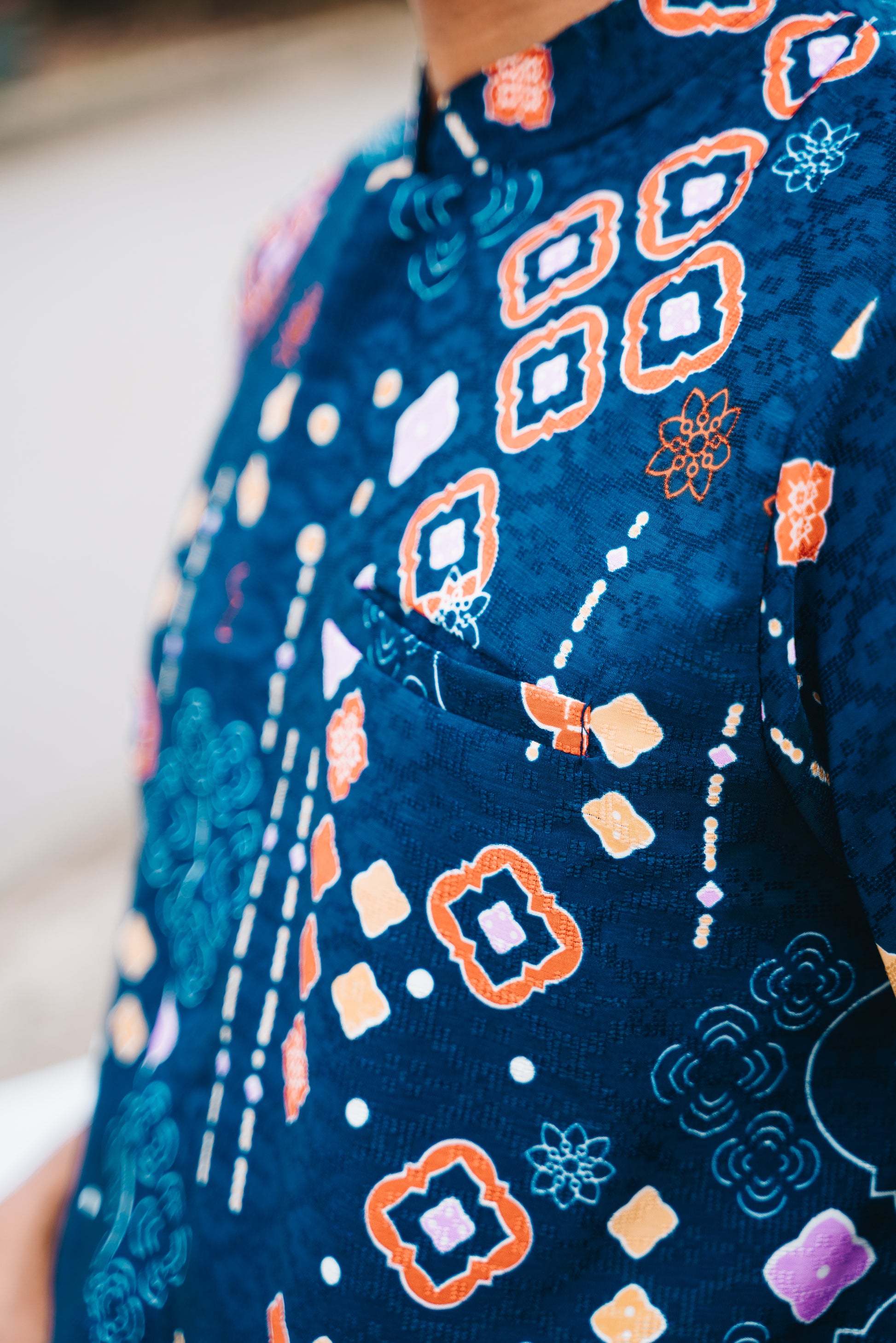The Bulan mens shirt is a regular cut short-sleeve shirt which features a mandarin collar, along with a front pocket. The Bulan print features Japanese inspired geometric prints, along with contrasting colours for a more oriental look. Breathable and perfect for tropical seasons, the shirt requires minimal to no ironing care.