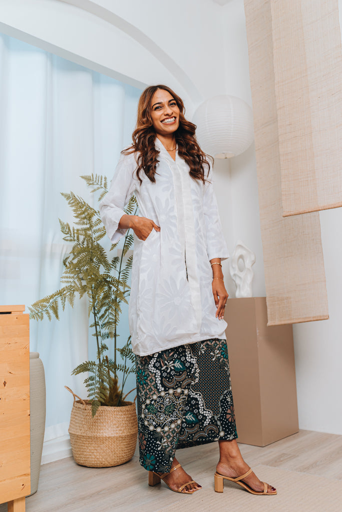 The white kebaya is fully lined, with a v-neckline, nursing friendly front zipper and two side pockets. Made from premium chiffon uragiri, the kebaya features a classic yet elevated look with the soft textured fabric.