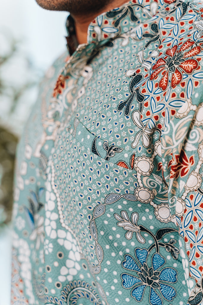 The print on the Kasih shirt is a blend of floral and miniature geometric shapes, which has the likes of the Sekar Jagad print. The regular cut shirt features a mandarin collar, kurta style buttons, along with front and side pockets. This print comes in 2 colours, black and wintergreen.