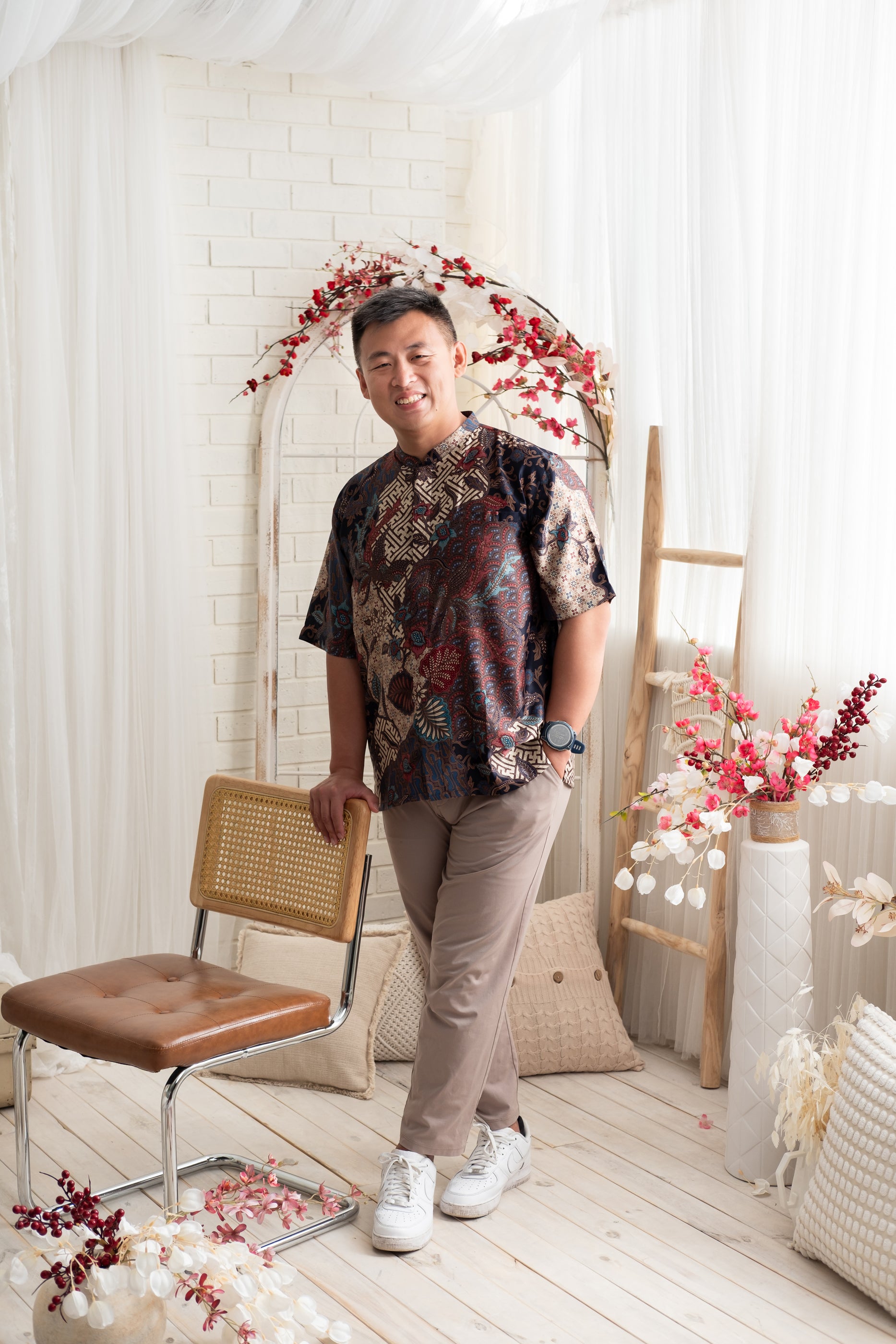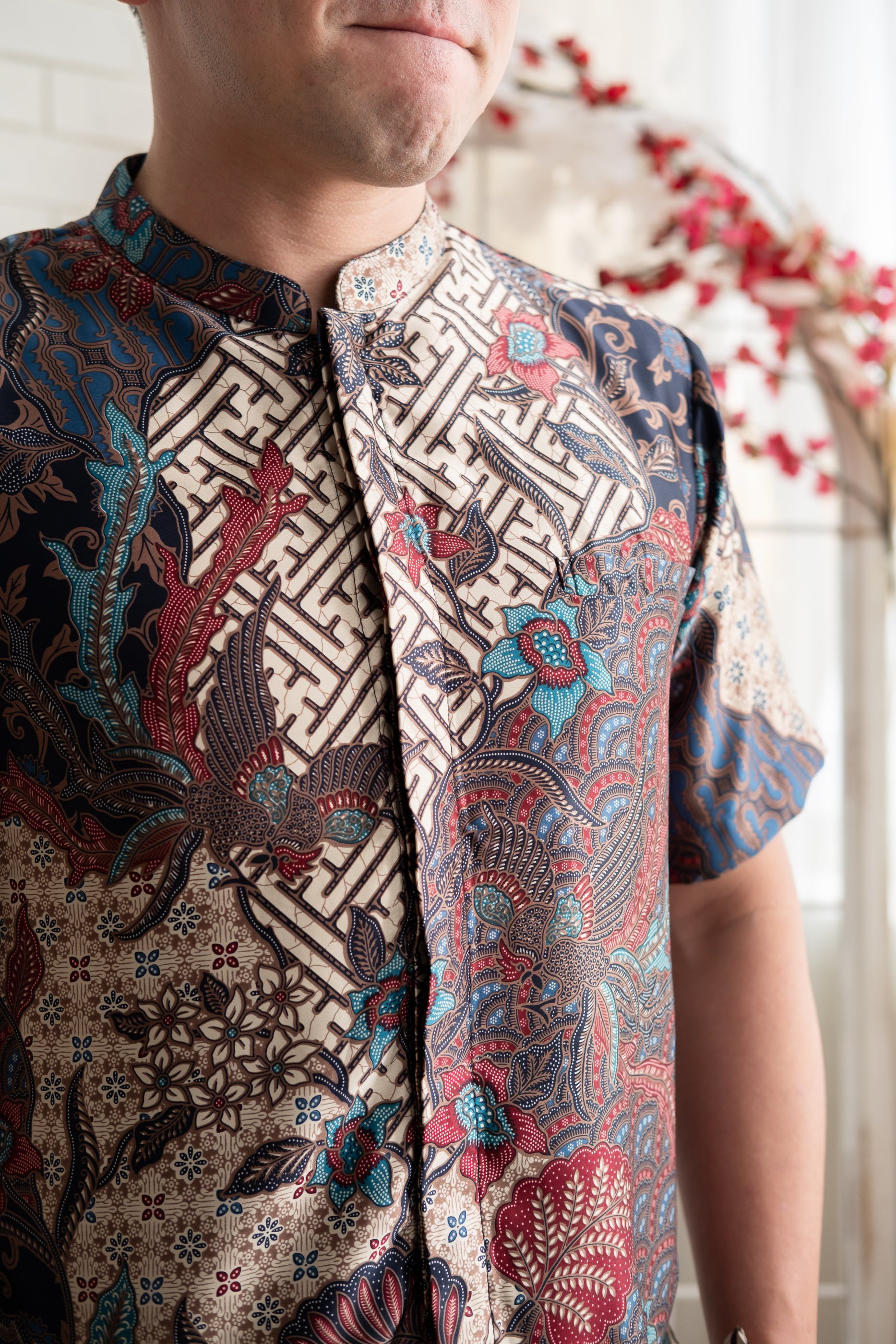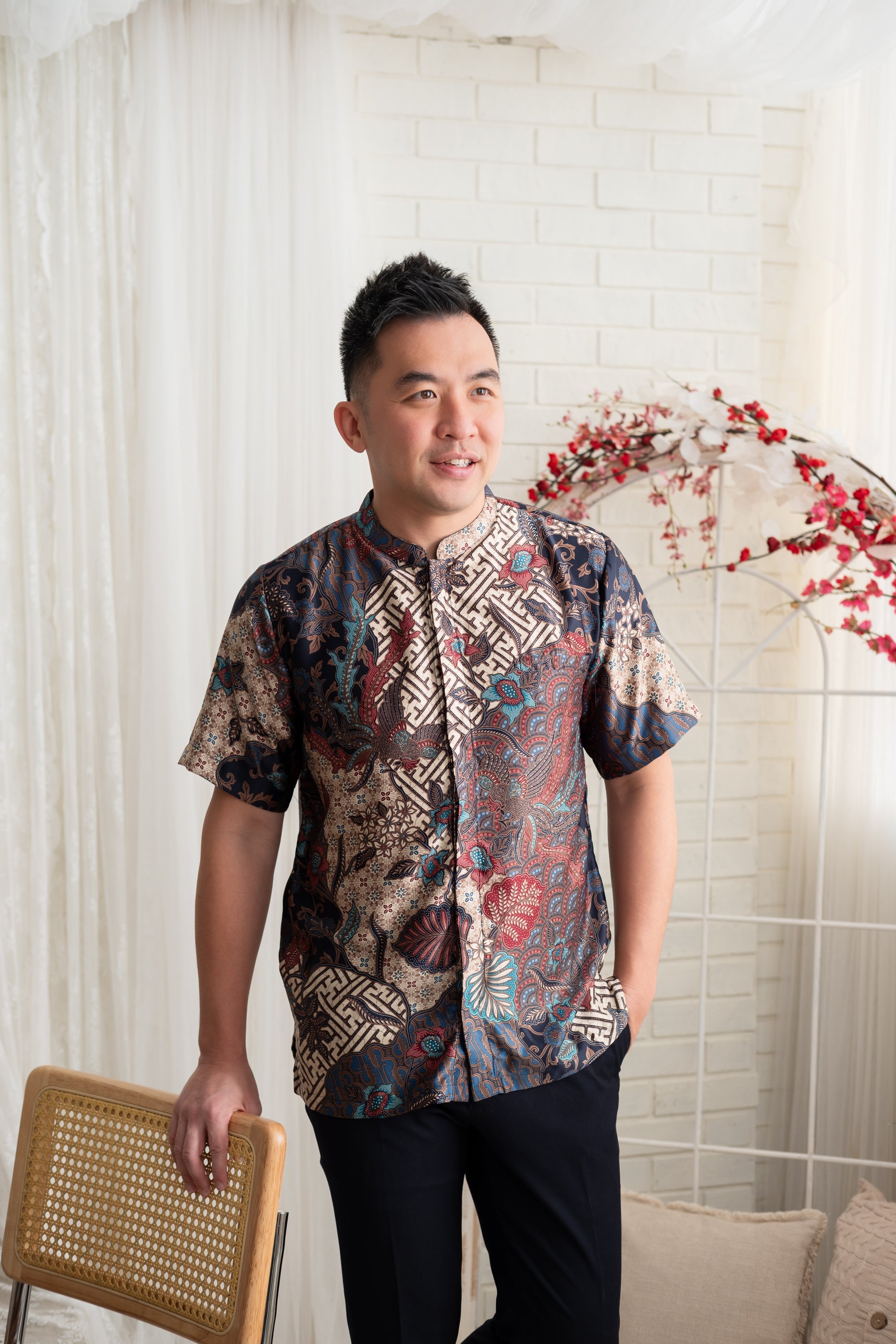 Tailored in a clean, modern silhouette, this batik shirt features a classic mandarin collar and a comfortable short-sleeve cut. Designed for ease and versatility, it’s a refined choice for festive celebrations or smart-casual wear.