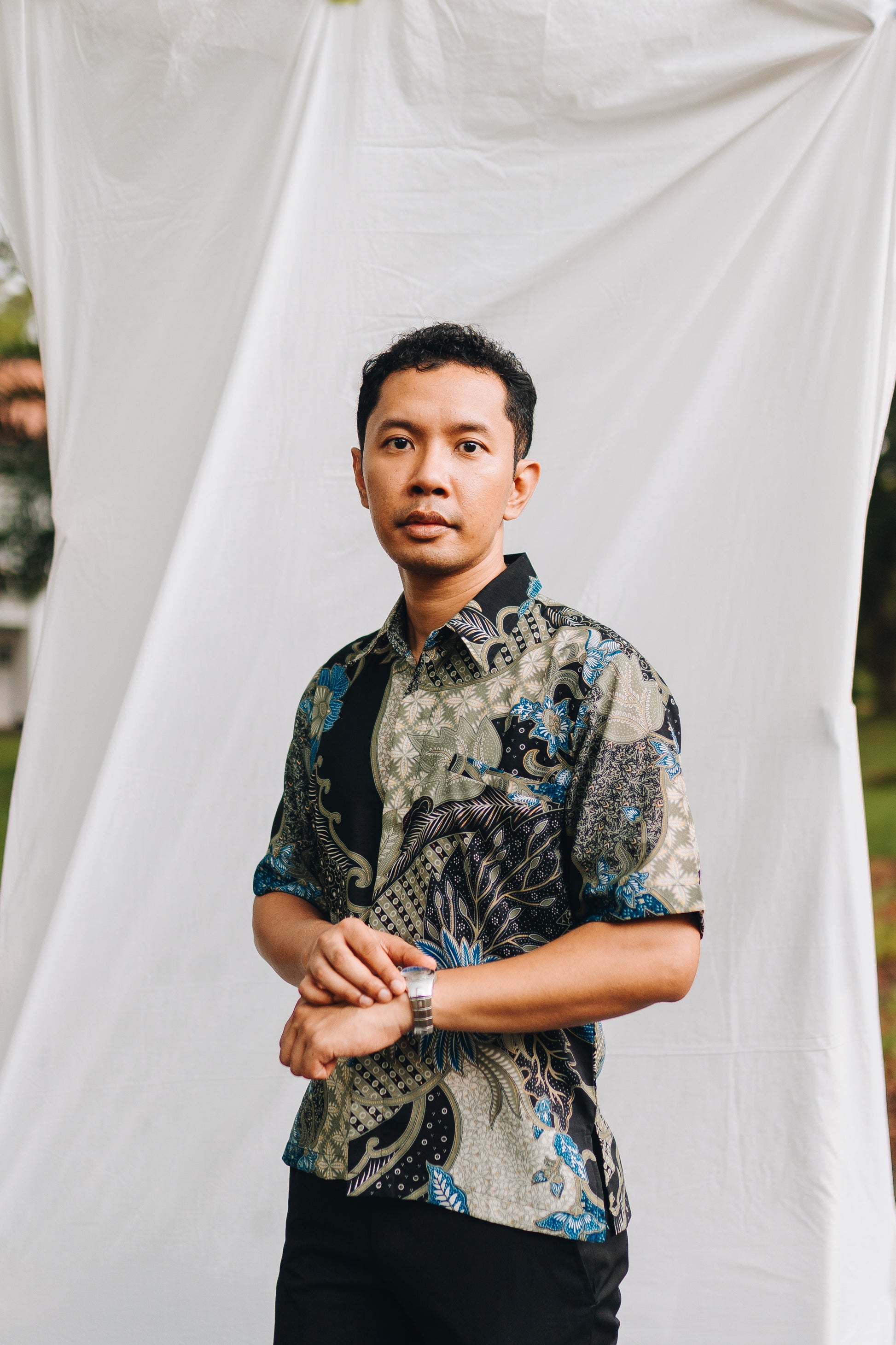 The Permata shirt is of a sage green and grey base colour. The regular cut shirt features a smart collar, hidden full down buttons, along with front pocket.